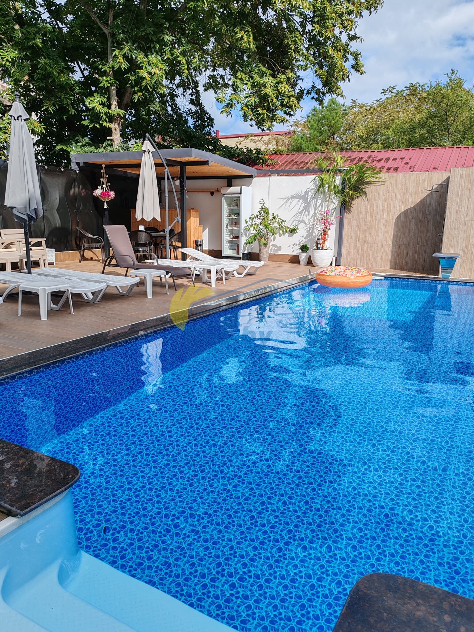 С 2024 года в гостевом доме открылся собственный бассейн. Возле бассейна шезлонги, зонты.